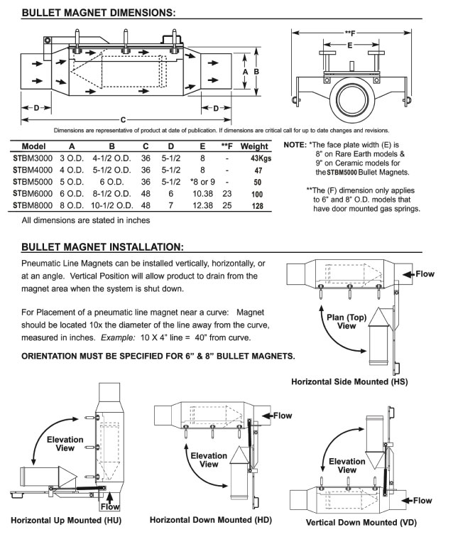 The nose cone diverter and magnet assembly of the Bullet is designed to maintain a balanced flow through the housing thereby maintaining uniform velocity in line flow. Ideal for dilute phase systems, typical Bullet Magnet applications include: movement of powder and granular flour, chemical, plastic, food stuff, pharmaceutical and mineral materials.